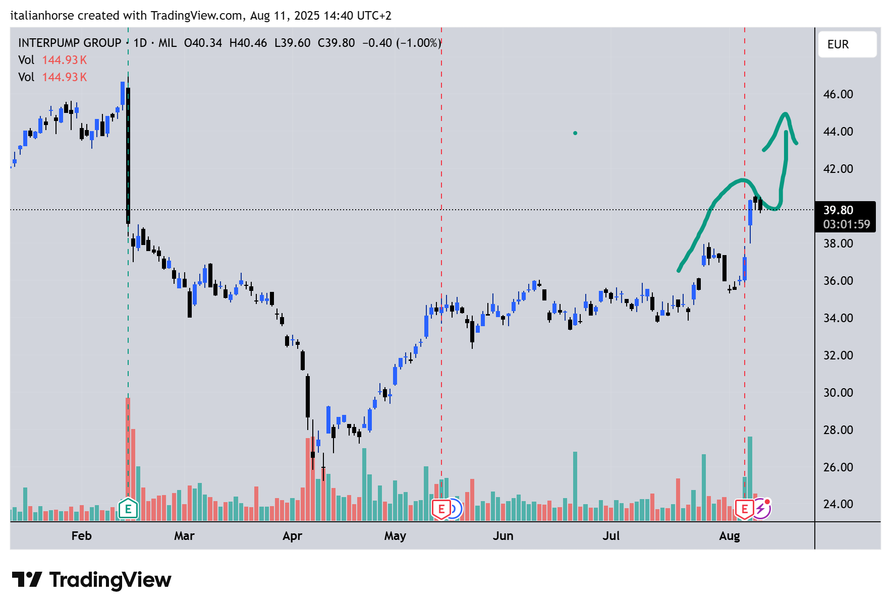 INTERPUMP: ha iniziato alla grande a recuperare il barrone ribassista. Compriamo alla garibaldina 40,97 stop, stop loss 38,80, target 47,00. Girano strane voci sul titoli di un potente recupero aziendale, per il momento niente di ufficiale, noi crediamo ai grafici e non alle voci. E i grafici mostrano un uncino potentissimo.
