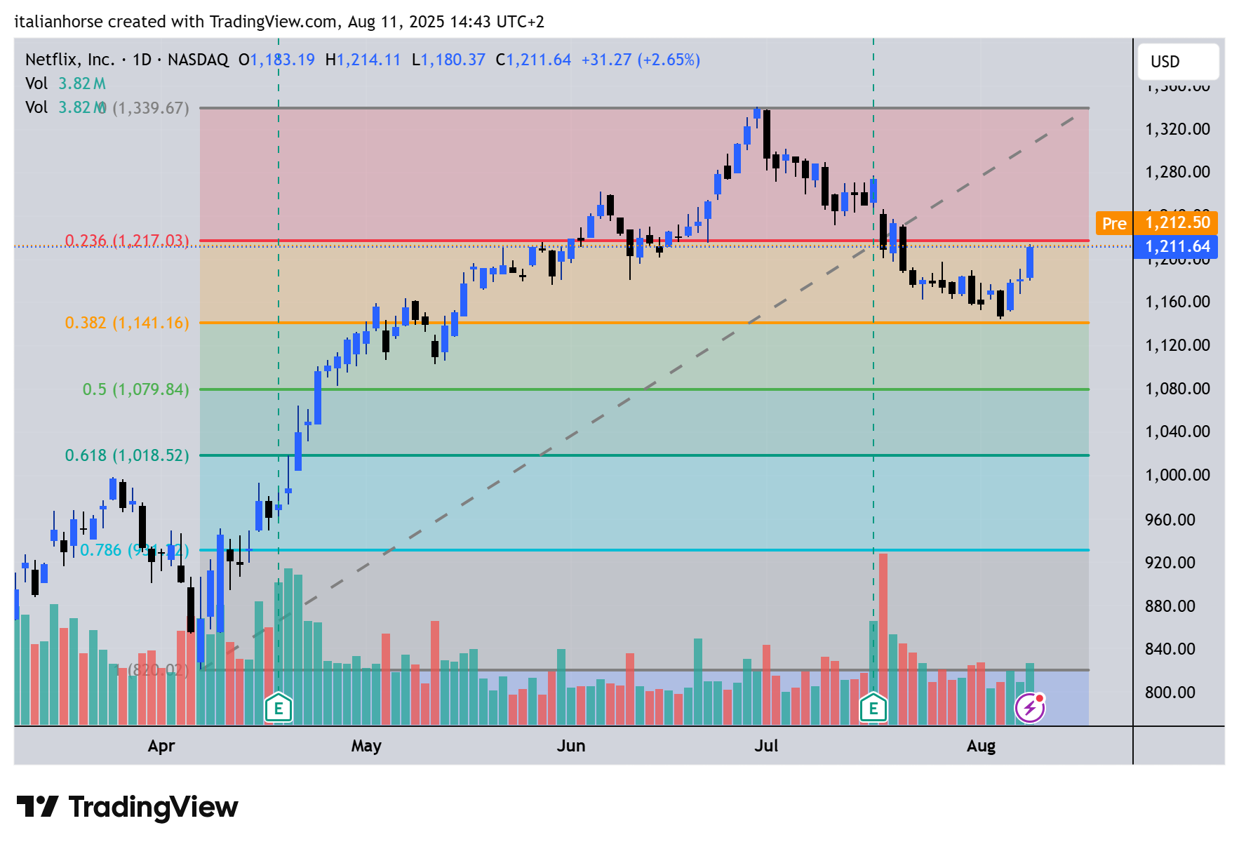 NETFLIX: proviamo il buy a 1197 limite, stop loss 1018, target 1293. Se posso aggiungere un commento tecnico mi piace la figura da cucchiaio di accumulazione … belli anche i volumi e siamo sotto i massimi in una fascia orizzontale. Trade a basso rischio.