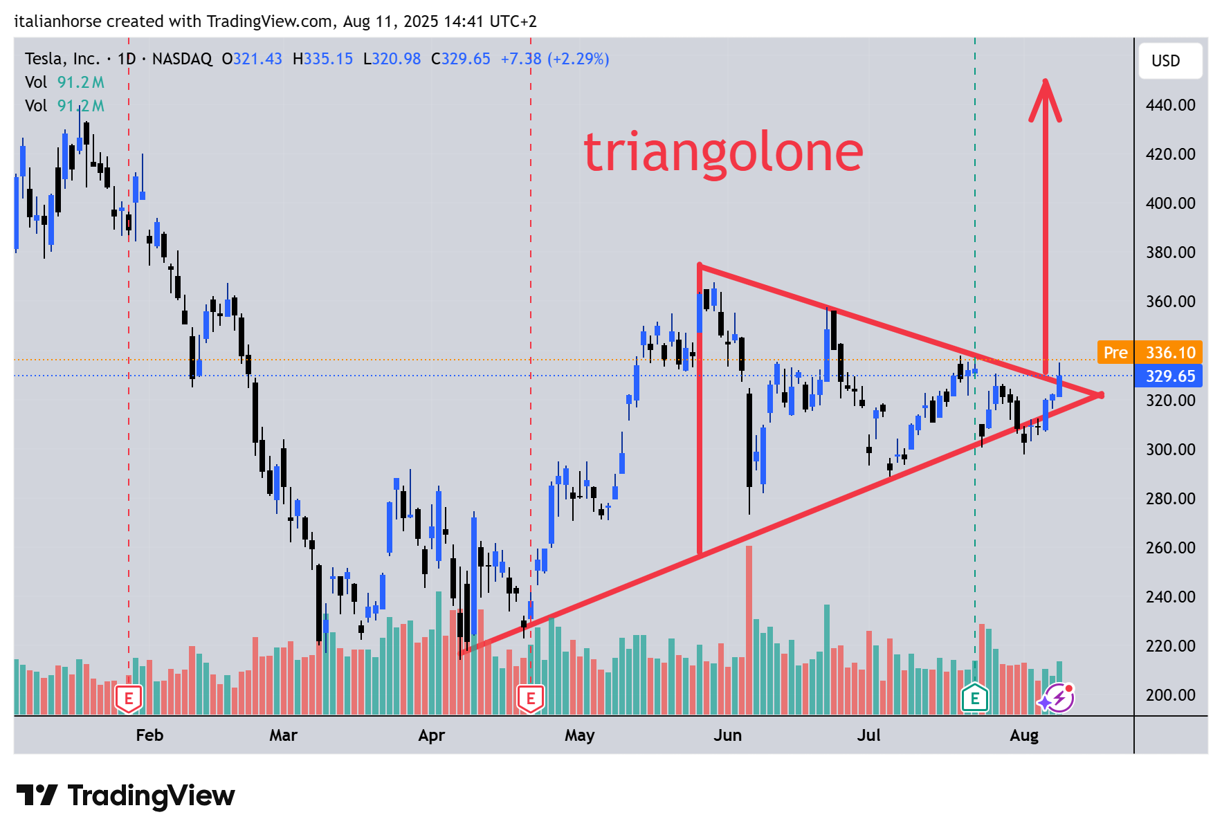 TESLA: siamo al vertice del triangolo e sembra che avremo una apertura forte: piazziamo un buy 338 stop, stop loss 295, target 450 alla proiezione del triangolo