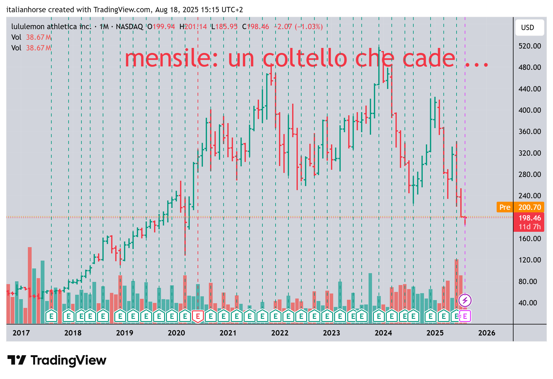 LULU (lululemon athletica inc. NASDAQ): Lululemon Athletica progetta, distribuisce e commercializza abbigliamento sportivo, calzature e accessori destinati a donne, uomini e ragazze. Il gruppo offre una gamma di prodotti che spazia da pantaloni, shorts, top e giacche, pensati sia per il tempo libero sia per attività sportive come yoga e corsa. A completare l’offerta figurano accessori per il fitness, tra cui borse, tappetini e attrezzature specifiche.La società distribuisce i propri articoli attraverso canali digitali, una rete selezionata di partner wholesale, oltre 760 negozi di proprietà in circa due dozzine di Paesi tra Nord America, Asia ed Europa occidentale, e circa 40 punti vendita in franchising in Medio Oriente. Fondata nel 1998, Lululemon ha sede a Vancouver, in Canada. I dati di bilancio sono eccezionali: ROIC - WACC stabile sopra il 30% (ripeto a lettere trenta per cento ... pronto ?), tasso di crescita medio composto a 3 anni del +23,4%, margine operativo lordo del 23,37%. Tecnicamente ha ritracciato parecchio dai massimi, il p/e è diventato conveniente rispetto alla sua storia e rispetto ai concorrenti. E’ chiaro che stiamo comprando un coltello che cade ... Compriamo 202 stop, stop loss 171, target 220