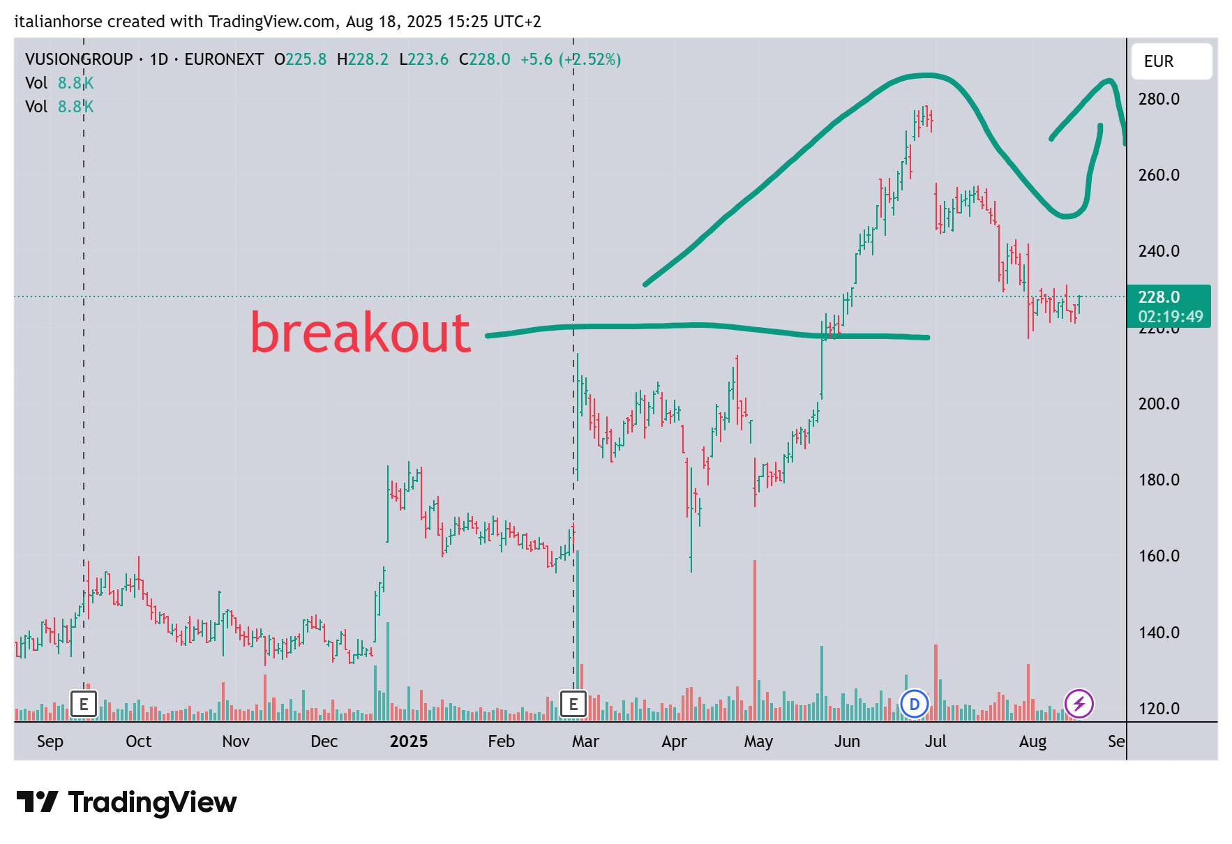 VUSION GROUP (simbolo VU, euronext Parigi): azienda che si occupa della logistica delle aziende normali trasferendola in cloud. Dati fondamentali non esaltanti. Tecnicamente è il nostro pattern: breakout e ritracciamento fino al punto di breakout. Compriamo 231 stop, stop loss 196, target 250