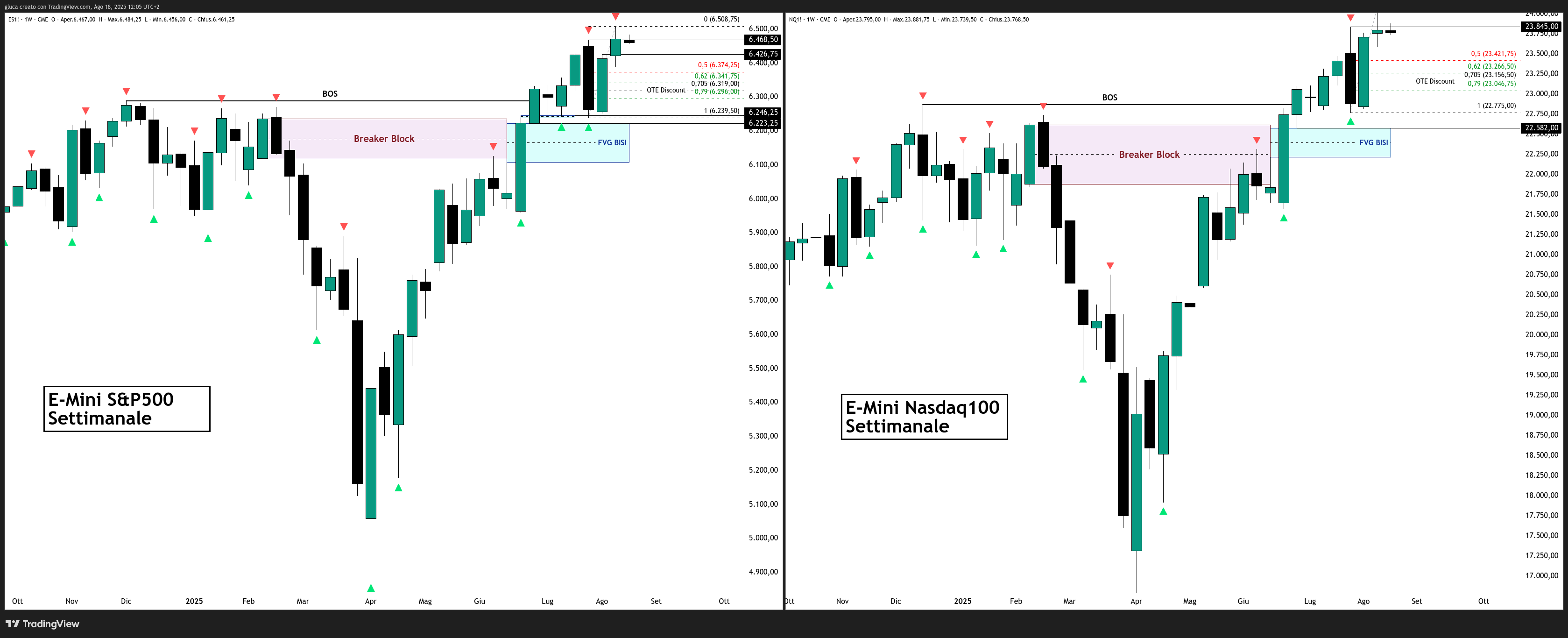 L’E-Mini S&P500 e l’E-Mini Nasdaq100, dopo il breakout dei massimi storici del 12 agosto con displacement daily e relativo Fair Value Gap di riferimento, hanno negato la formazione di un FVG BISI settimanale.