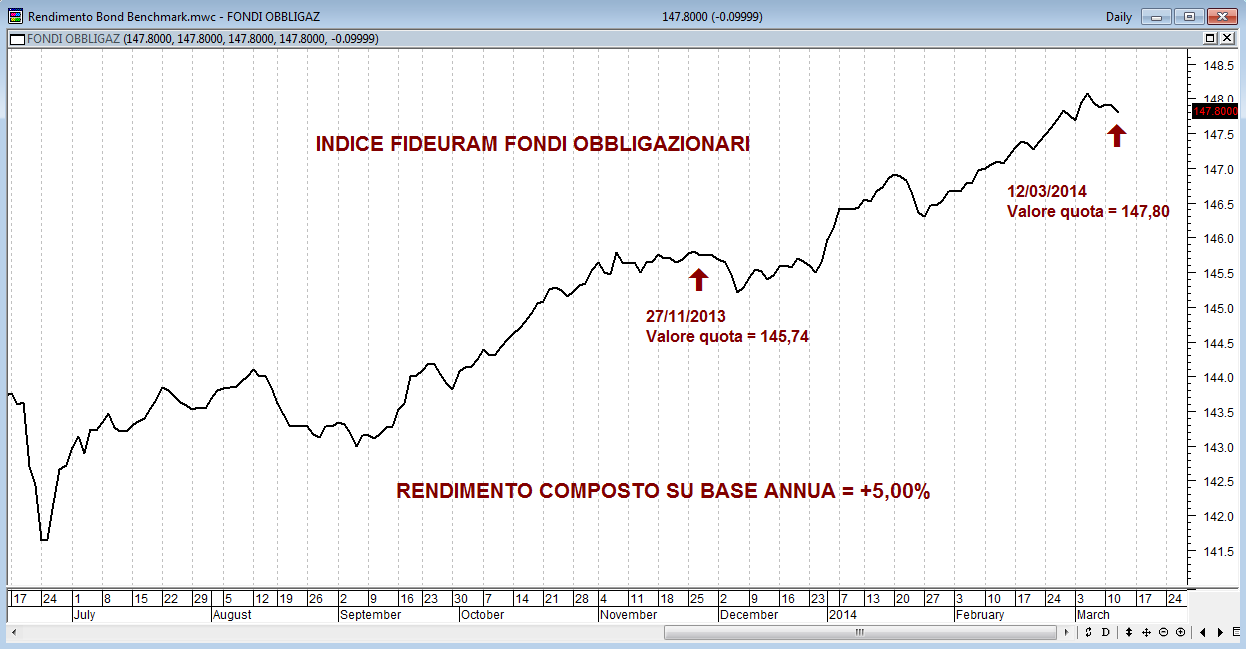 Confrontando tali risultati con il Benchmark di riferimento, individuato nell’indice Fideuram Fondi Obbligazionari (che rappresenta la media dei rendimenti di tutti i fondi obbligazionari), notiamo una netta overperformance dei nostri portafogli, come illustrato nel grafico sottostante.