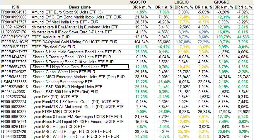 Vediamo cosa ci dice il modello ora in anticipo rispetto all'uscita di rendimento fondi: ho segnato in verde il ranking agostano e lo ho postato rispetto a luglio e giugno.