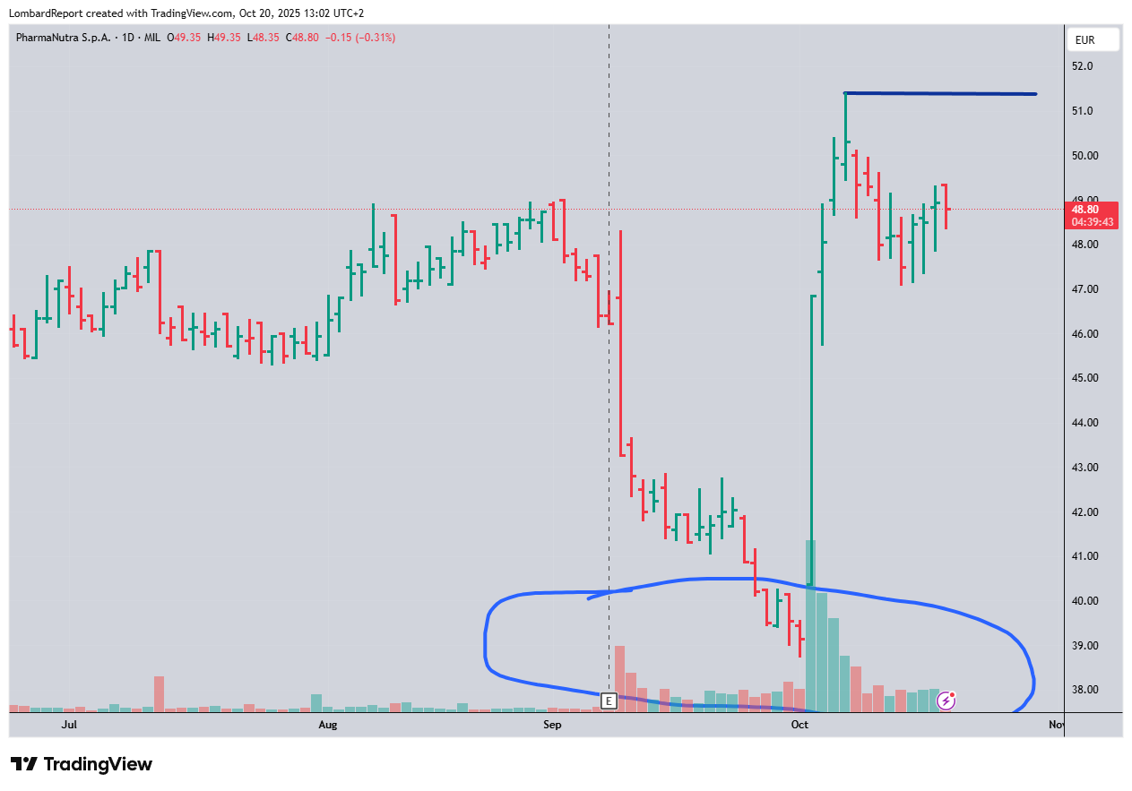 Se consideriamo solo l’analisi tecnica è un buy grande come una casa. Bottom up a v con volumi che sono stabilmente sopra la media scambiata quotidianamente durante il ribasso. Qui gatta ci cova.