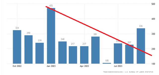 I dati odierni Non Farm Payrolls hanno sostanzialmente rotto una trendline che da gennaio 2023 con un valore di 472 posti di lavoro creati si era inclinata negativamente fino a toccare i 227 posti di lavoro creati ad agosto 2023, per poi riprendere con un aumento ad oggi ad oggi di 336.000 posti di lavoro creati.