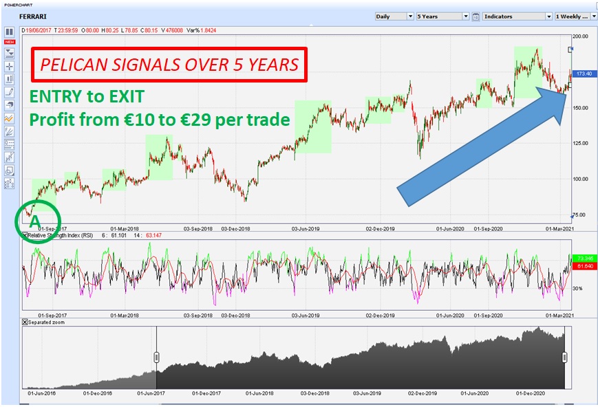 Come si può vedere dal grafico il Pelican trading system rileva il primo segnale di entrata a mercato nel punto A e il punto di uscita in corrispondenza della fine del box verde.