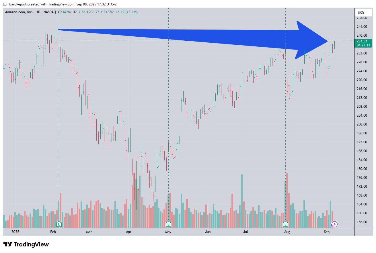 AMAZON: dobbiamo comprarla, anche se alla garibaldina, perché siamo su un massimo relativo poco sotto un massimo storico che funge da magnete. Vecchio pattern della nonna, non possiamo farcelo scappare.