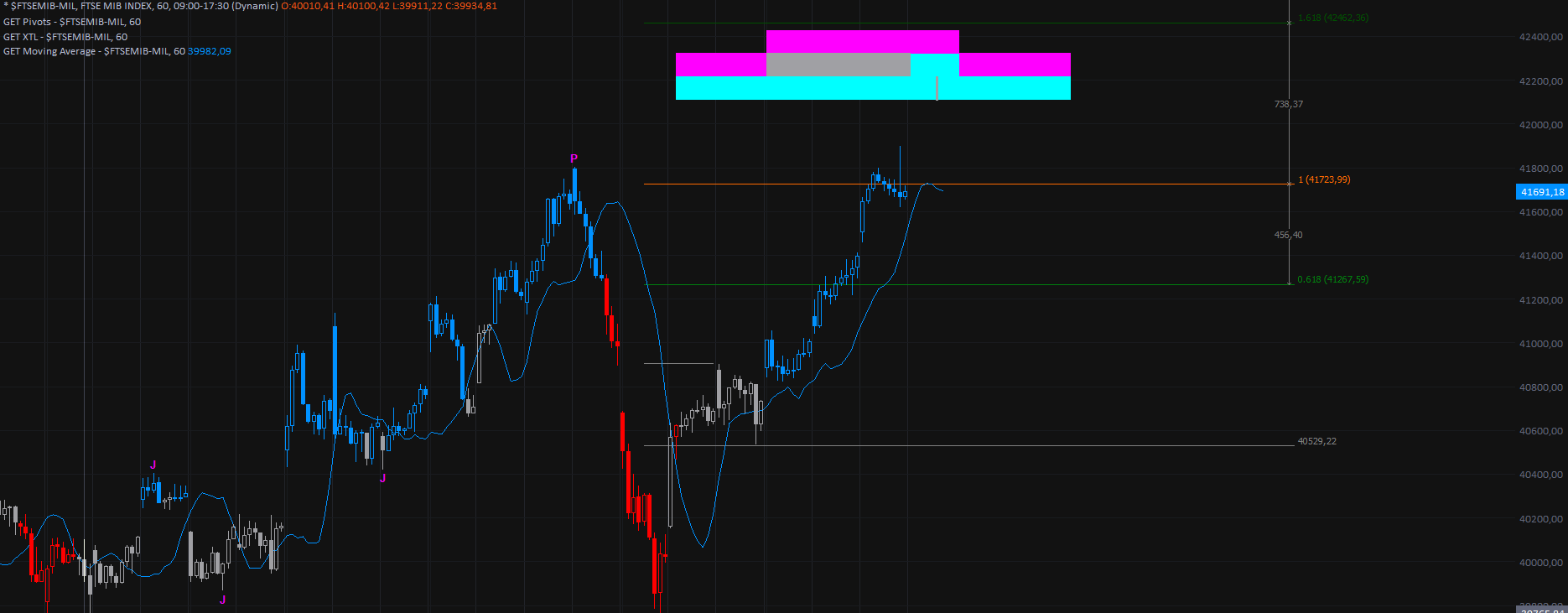 Il FTSE MIB 40 ha confermato con decisione la volontà di proseguire verso nuovi massimi, già superati nella seduta di venerdì. L’obiettivo immediato si sposta ora sulla prossima area di resistenza compresa tra 42100 e 42400 punti.