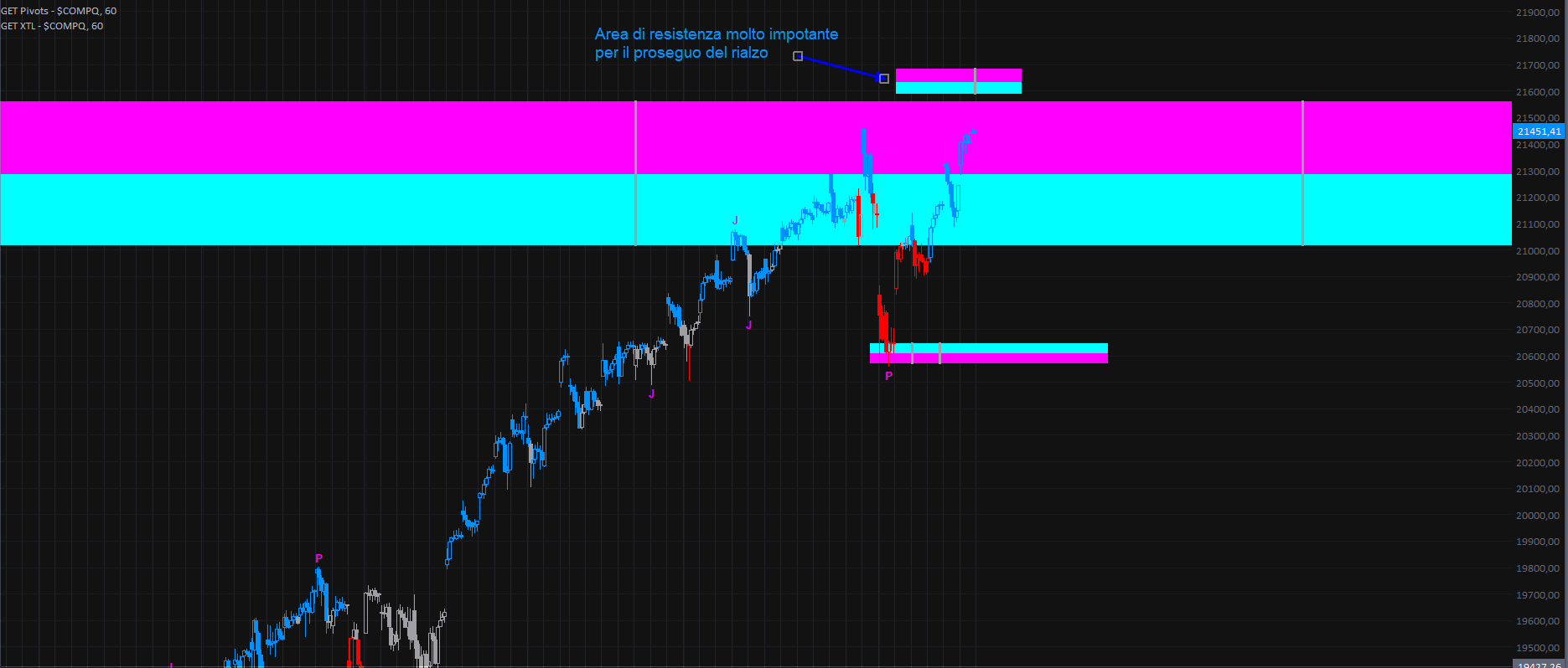 Questo scenario si concretizzerebbe con la rottura della MOB superiore, quella di dimensioni più contenute visibile chiaramente nel grafico a 60 minuti (area 21600/21700).