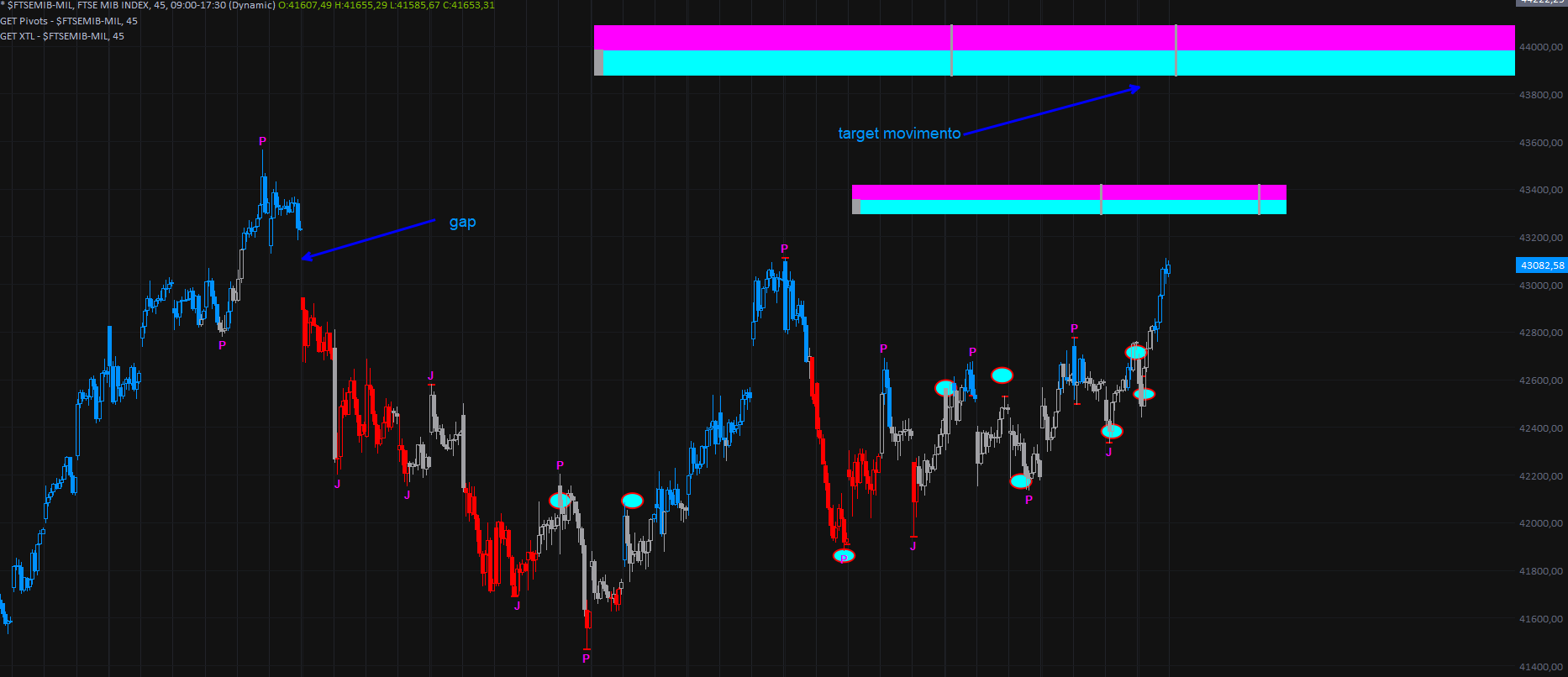 L’obiettivo del movimento in atto resta invariato in area 44000 (vedi MOB sul grafico sotto a 45 m) ma prima il mercato dovrà affrontare un ostacolo intermedio, rappresentato dall’area compresa tra 43300 e 43560.
