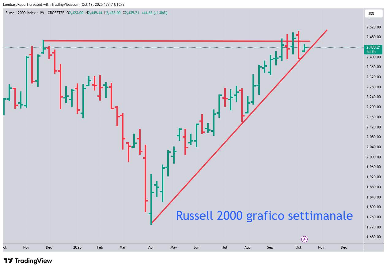 La situazione tecnica sul Russell 2000 che dà il polso al mercato americano è ben rappresentata dal grafico che segue che mostra come la trendline rialzista resiste ancora degnamente alle grinfie dell’orso.