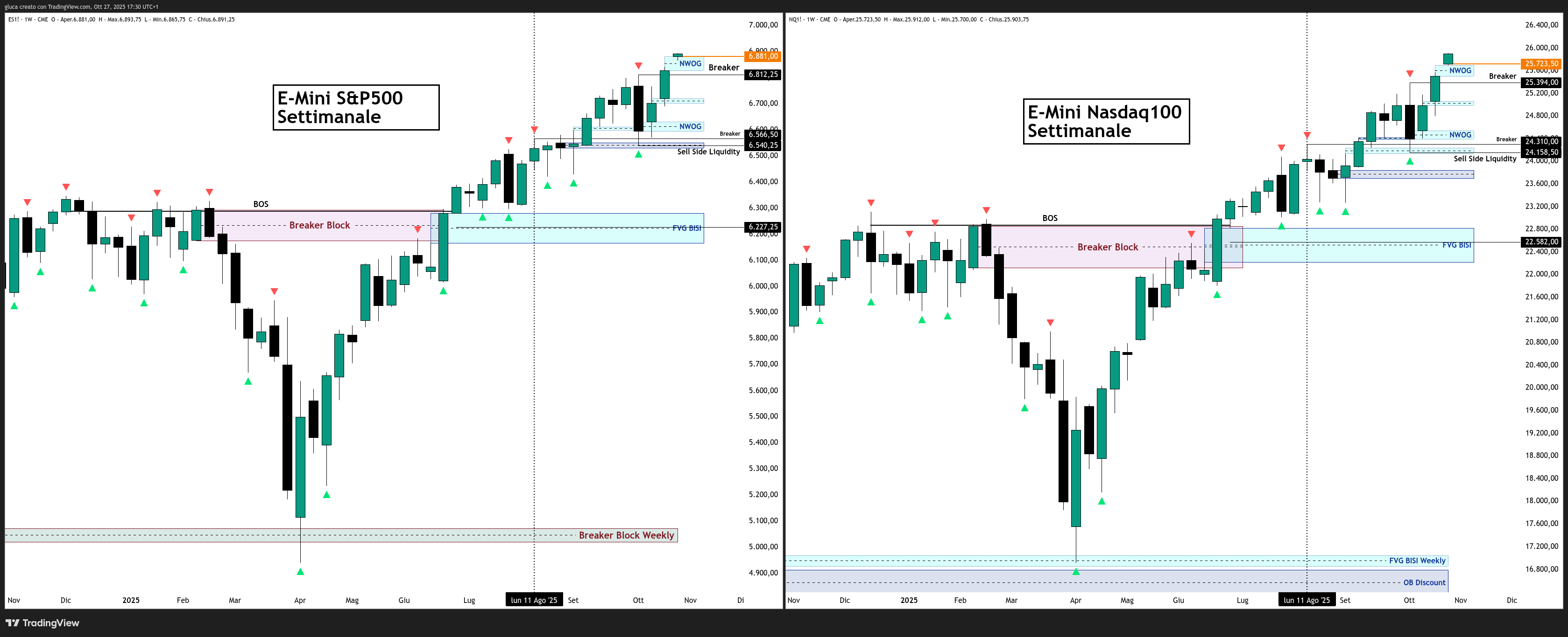 I livelli di apertura settimanale – 6881 per l’E-Mini S&P500 e 25723,50 per l’E-Mini Nasdaq100 – rappresentano la struttura cardine della settimana: il mercato tenderà a sviluppare un range di accumulazione intorno a questi valori, probabilmente identificabile nei massimi e minimi della candela daily del lunedì.