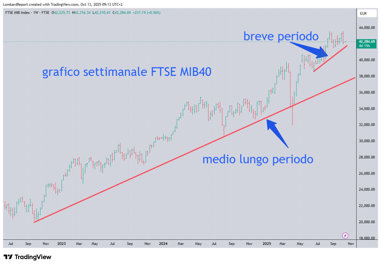Pubblico il grafico del Ftse MIB 40 per mostrare come se il nostro triangolo è andato a farsi friggere alla fine della fiera rimaniamo sempre e comunque sopra la trendline di breve periodo e quindi al momento dobbiamo pensare a continuare a comprare, lo so che è da matti ma è quello che ci dicono i grafici a cui ci dobbiamo affidare in questo momento. La trendline di medio lungo periodo, comunque la vogliate tracciare, passa molto di sotto.