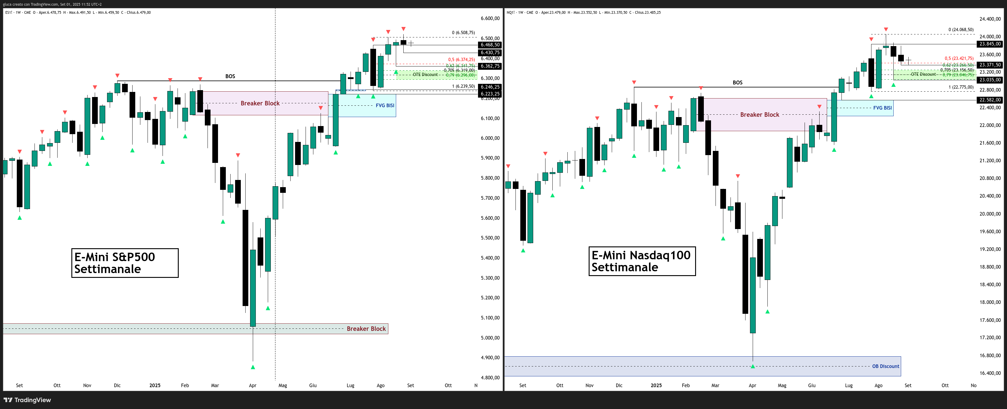 In questo contesto, lo scenario più probabile resta una manipolazione dei minimi in area OTE Discount. Per l’E-Mini S&P500 i livelli chiave da monitorare si collocano a 6.430,75 e 6.362,75, mentre per l’E-Mini Nasdaq100 i riferimenti tecnici si trovano a 23.371,50 (già raggiunto questa mattina) e 23.035.