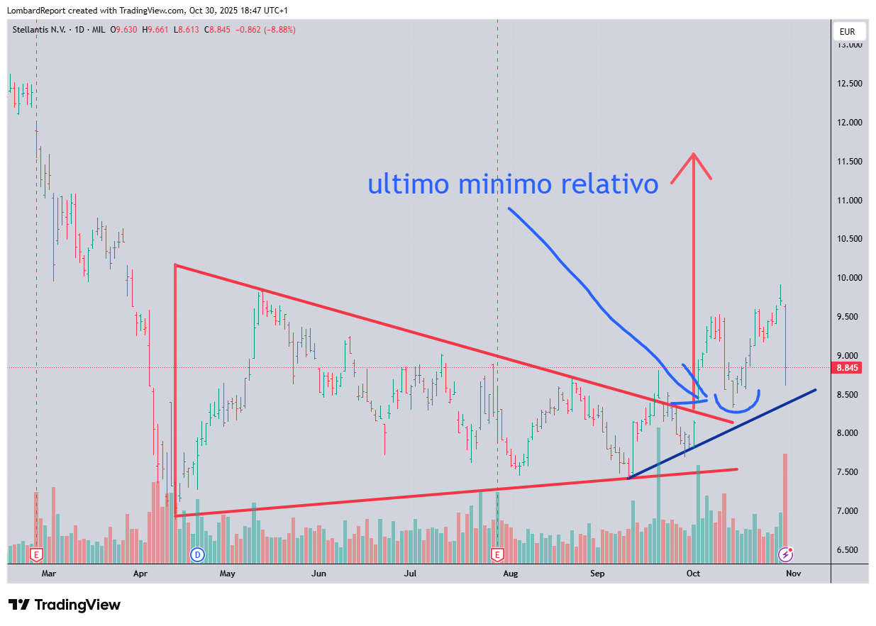 Oggi è stato il giorno di Stellantis che ha vissuto momenti difficili. La chiusura è stata brutta, non c’è da dire nulla di più. Però dobbiamo tenere in conto che siccome non possiamo prevedere il futuro ci dobbiamo basare sui dati che abbiamo in mano. E i dati che abbiamo in mano sono sotto il profilo fondamentale il rialzo dei ricavi e delle consegne nel terzo trimestre dopo 7 trimestri di calo e soprattutto a livello tecnico un bottom up che nonostante il ribasso di oggi rimane intonso. Come dimostra il grafico siamo a cavallo della trendline di breve e comunque sopra il minimo relativo precedente. Io terrei botta, abbiamo resistito finora e scappare ora non avrebbe senso, almeno per il portafoglio Value.