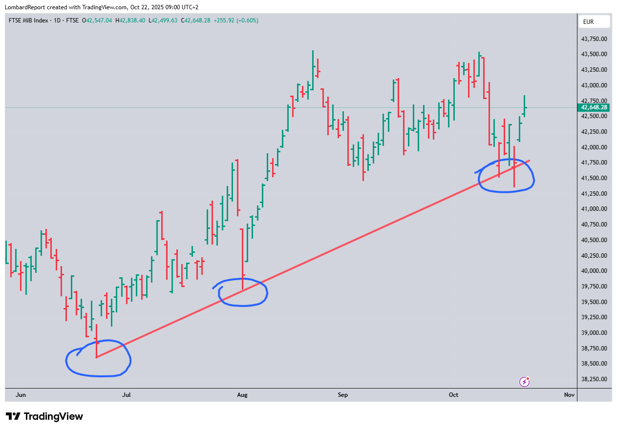 A livello di indice sul nostro mercato abbiamo la tenuta spettacolare di una trendline con un micro doppio minimo e quindi ora siamo lanciati verso i massimi dei massimi, come del resto lo sono gli indici azionari italiani: