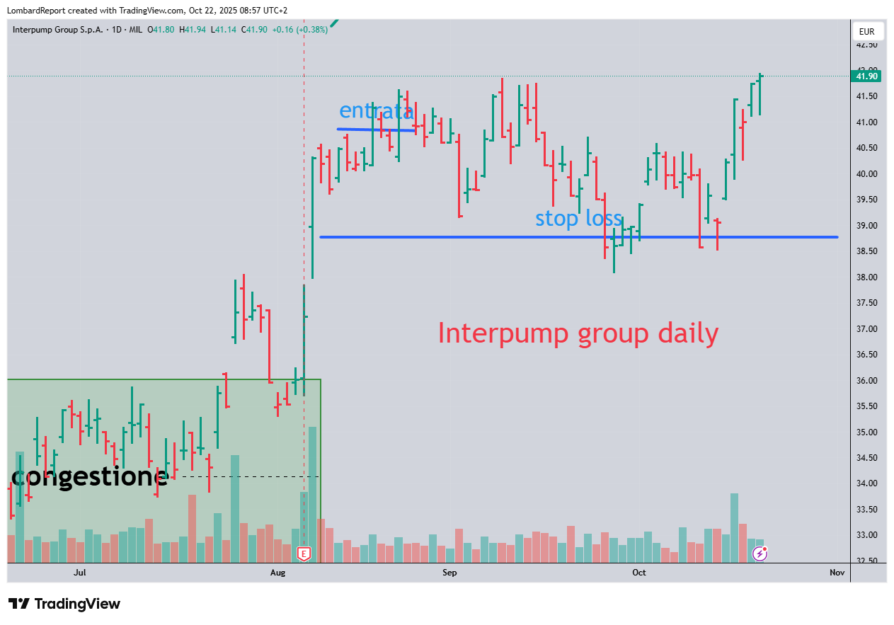 INTERPUMP: siamo sempre positivi, ci hanno fatto con lo stop loss troppo stretto ma ieri sera ha rotto la resistenza e siamo in attesa di ulteriori notizie positive. Da riprendere non appena ce ne dà la possibilità.