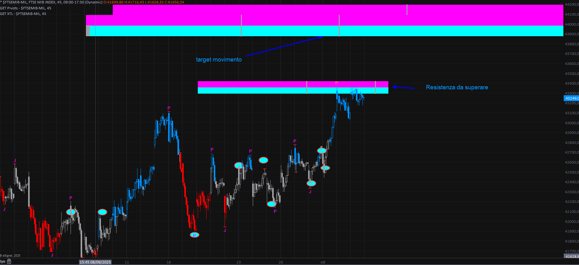 Anche per il mercato italiano poco di nuovo: l’impostazione resta positiva e il movimento continua a essere indirizzato verso l’area dei 44000 punti, con la necessità di superare prima la resistenza in essere tra 43300 e 43500 (vedi grafico a 45 minuti).