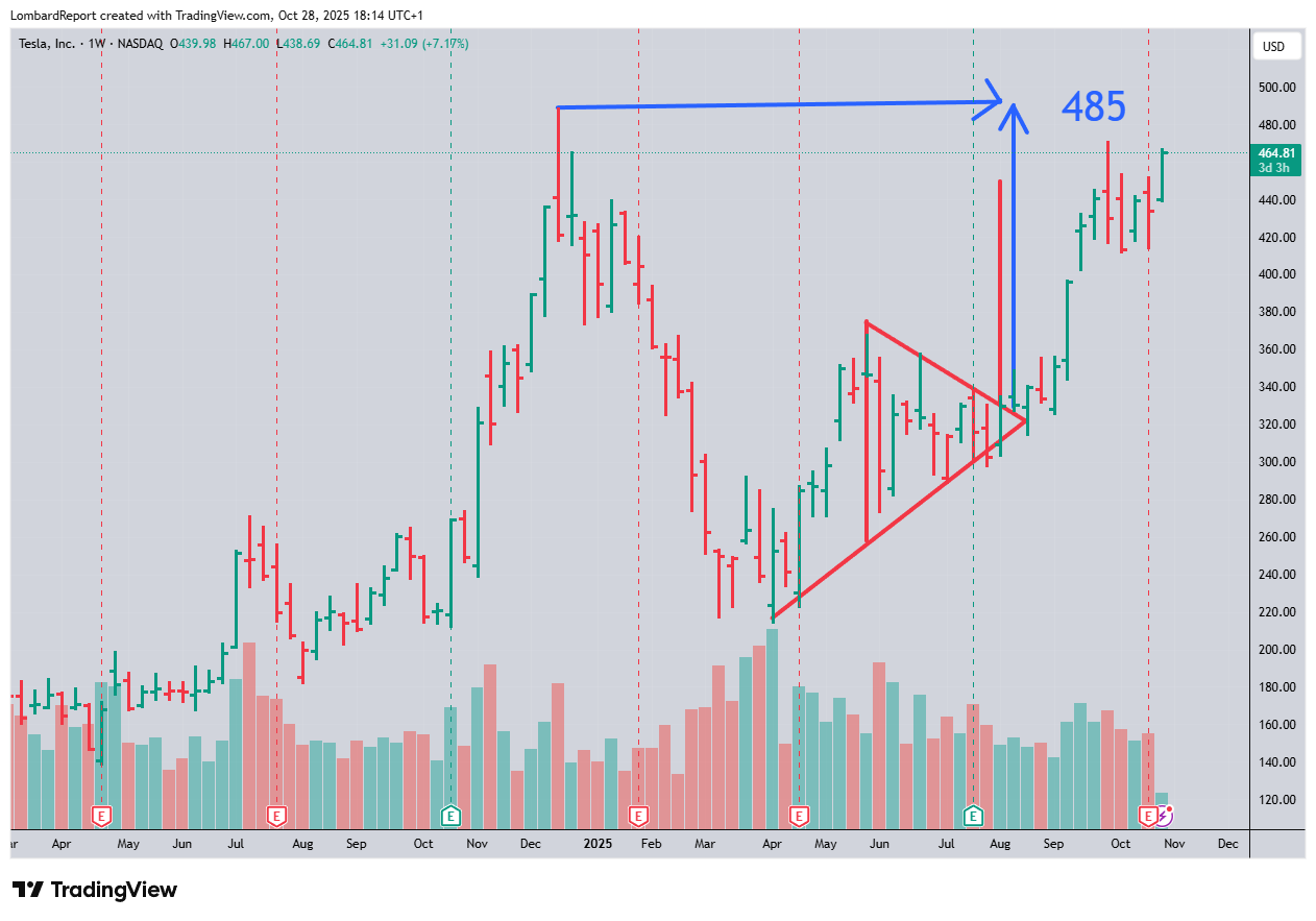 TESLA: ha rotto il triangolo come avevamo detto a suo tempo e l’obiettivo era a 485 ma se rompe 485 vola all’infinito e noi stiamo dentro e quindi mettiamo l’obiettivo di prezzo alle stelle e ci faremo sbattere fuori dal trailing stop. Mettiamo obiettivo impossibile a 650.