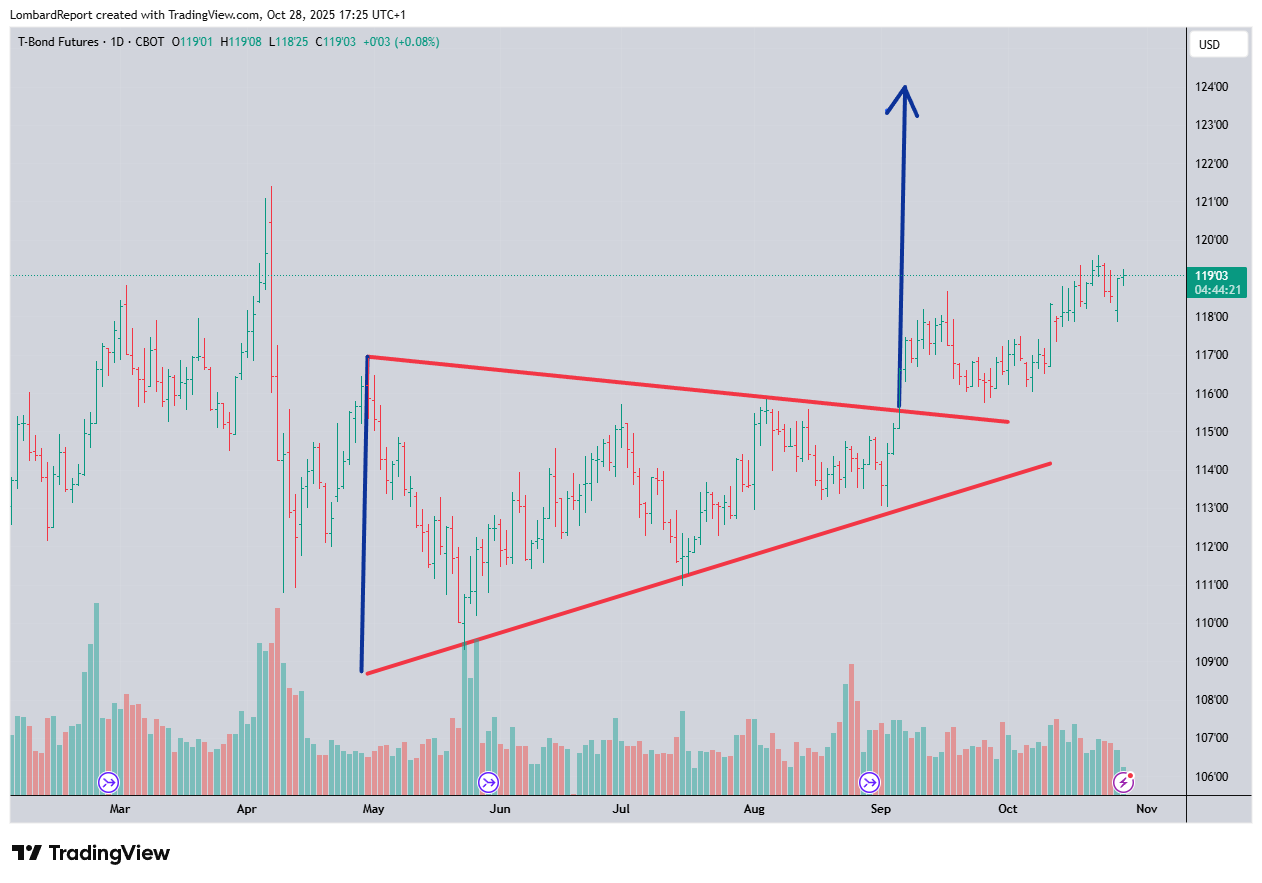 Il trend al rialzo non sarà messo in discussione dalla ricopertura del gap perché la Fed abbasserà di nuovo i tassi di mercato o almeno questo è quello che il mercato obbligazionario USA sta scontando ora. Se notate il T – BOND ha completato quella figura di congestione (triangolo) e sta puntando al rialzo con proiezione della base del triangolo stesso (linea blu):