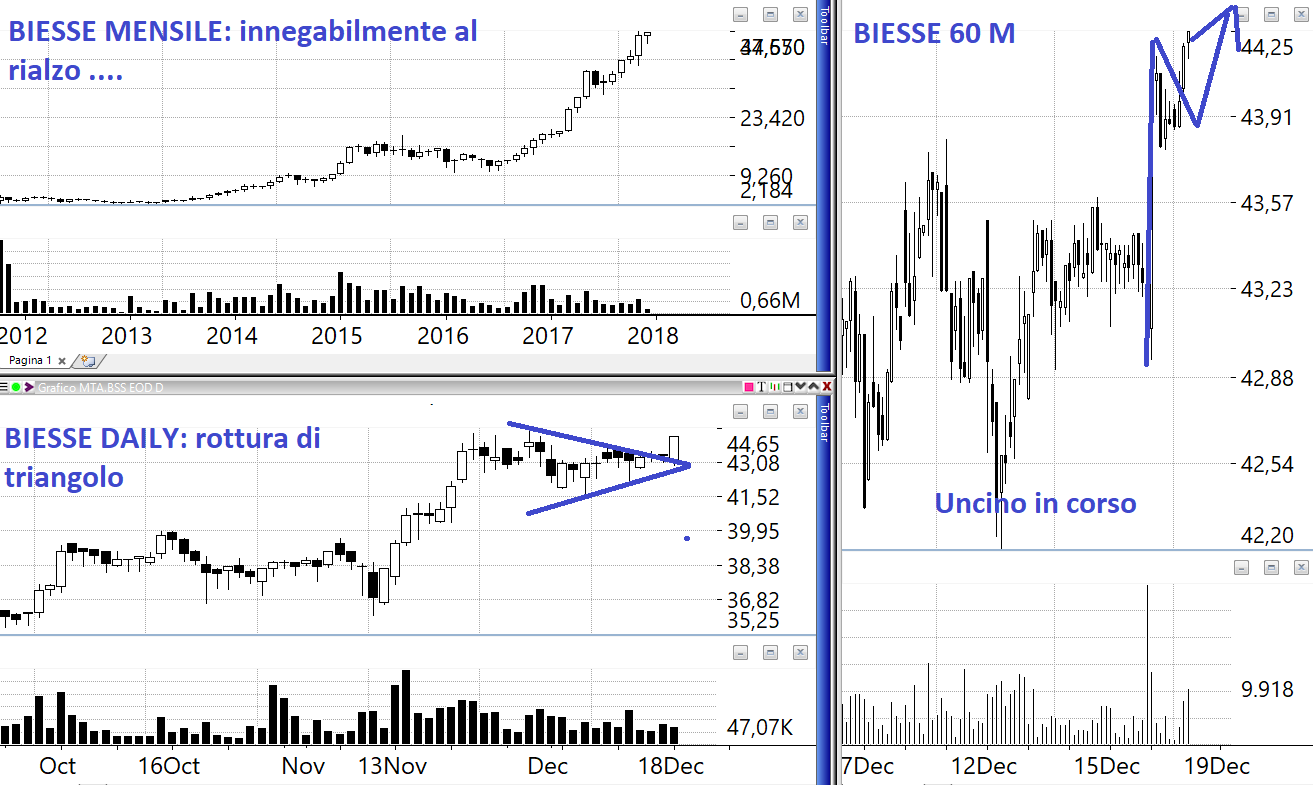 Confrontare gli indici azionari internazionali con quello italiano dà il polso della situazione più di mille altre analisi. Facendo i conti della serva possiamo dire che gli USA volano (e lo hanno dimostrato venerdì con la definizione del tax bill negli USA quando il Nasdaq, indice anticipatore per definizione, ci ha regalato un bellissimo breakout e poi anche oggi con una chiusura positiva), l’Europa va in orizzontale ma sembra puntare al rialzo con il DAX che finalmente oggi è partito, l’Italia è impaurita e smarrita trovandosi ad oscillare in un ampio e volatile canale orizzontale. Bene sicuramente il “rimbalzao meravigliao” di oggi, questo significa che per il momento non c’è traccia di ribasso. L’analisi tecnica è un approccio che necessariamente arriva in ritardo, ma che d’altra parte aiuta a non perdere la testa durante fasi che non sono chiare. Il miglior amico in Borsa è il trend, se lo perdi è come perdere l’ultimo treno in stazione. Quindi finché non vedremo una rottura decisa di un supporto sul nostro indice e il declino degli indici azionari internazionali dobbiamo mantenere la nostra view rialzista. Così funziona il gioco, non ci sono alternative. Tanto più che a livello di singole azioni è possibile constatare come esistano diverse situazioni interessanti di congestione all’interno di tendenze consolidate al rialzo, segnale inequivocabile che prima o poi ci sarà la ripartenza. Un mercato di solito non gira con congestioni orizzontali, gira con pattern molto volatili come il doppio massimo o il testa e spalla. Se guardate grafici come Saes Getters, che sta disegnando un triangolo simmetrico quasi perfetto, o Banca Generali sul mensile che ormai da 6 mesi ha massimi e minimi in orizzontale sempre uno inferiore all’altro o Bio On sull’Aim che non riesce più a muoversi se non in laterale, capirete che molte azioni sono bombe in attesa che qualcuno accenda la miccia. Altre azioni invece come Retelit e Mondo Tv hanno già il detonatore innescato.