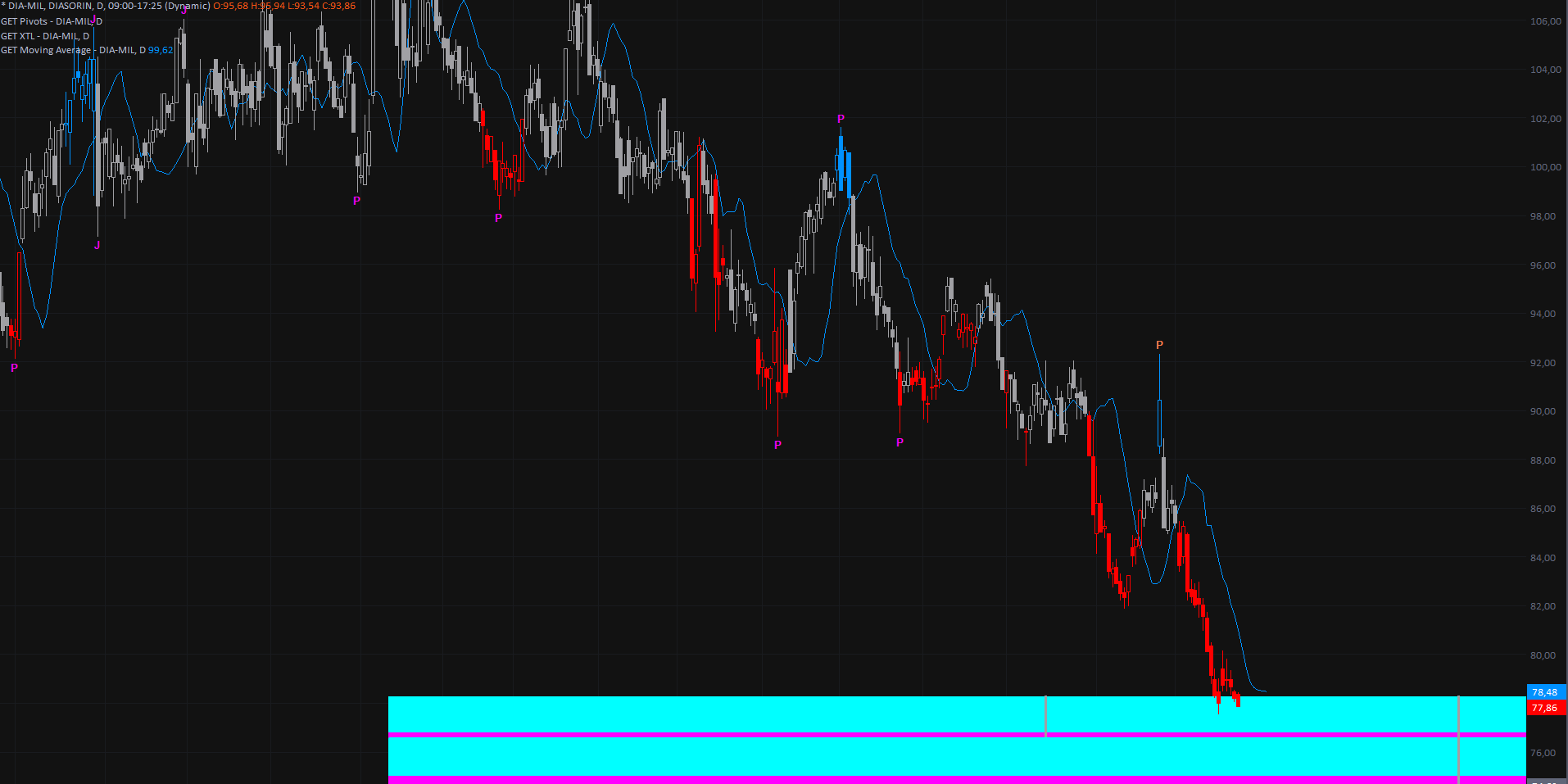 Da osservare con attenzione anche Diasorin, attualmente inserita in un forte trend ribassista ma in prossimità di una significativa accoppiata di supporti (MOB).
