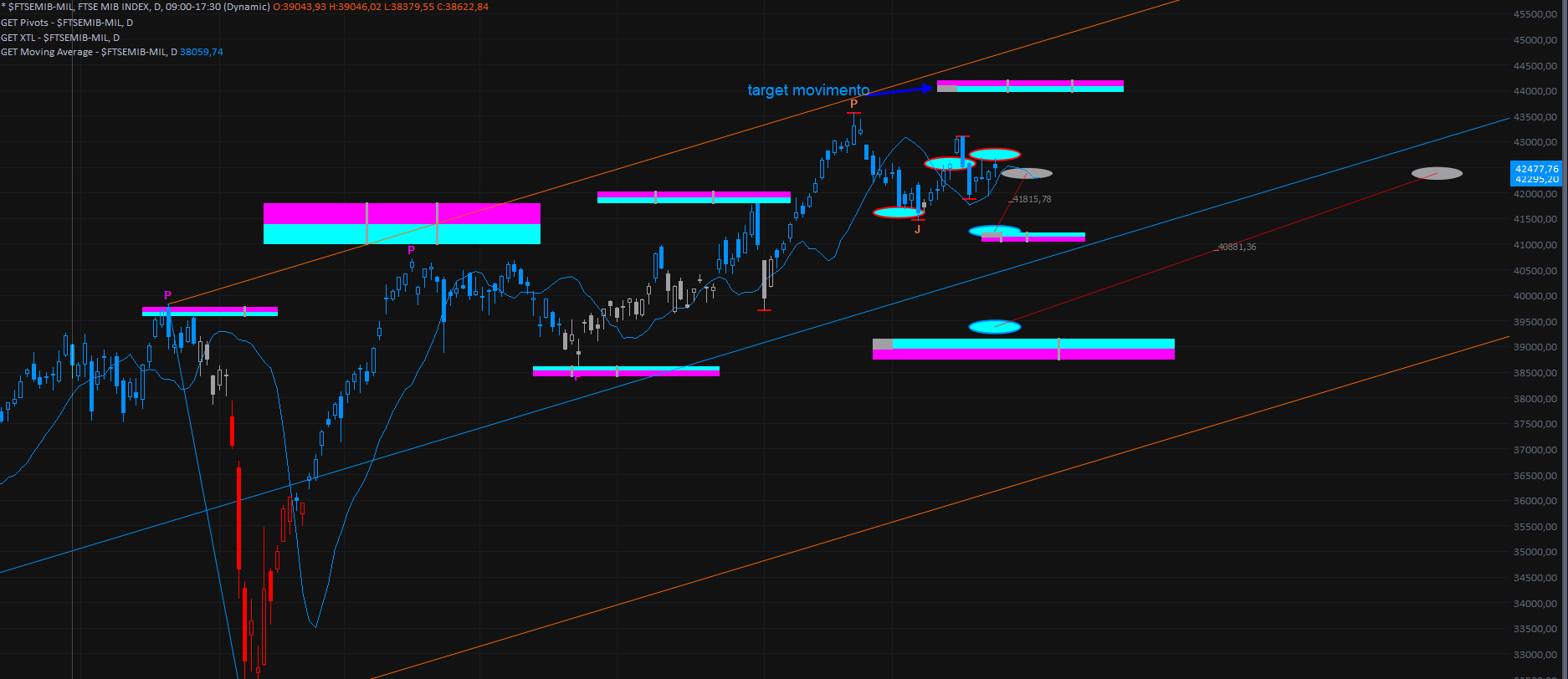In caso di storno, i livelli di supporto da monitorare sono area 41000 come primo riferimento, e successivamente e ben più rilevante per la tenuta della struttura complessiva, area 39000.