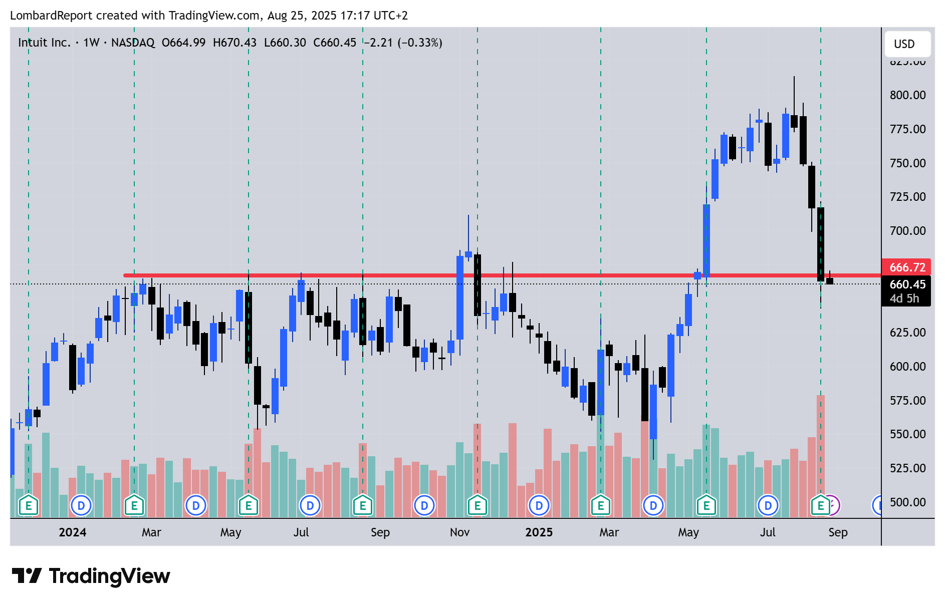 INTUIT: ottimi fondamentali, pattern grafico nostro tradizionale, gap al rialzo con rottura del massimo quindi tetto e gap ribassista con ritorno al punto di partenza a fronte di dati migliorativi rispetto alle stime (la borsa è dei matti). Buy 670,44 stop, stop loss 570,00, target 723,66.