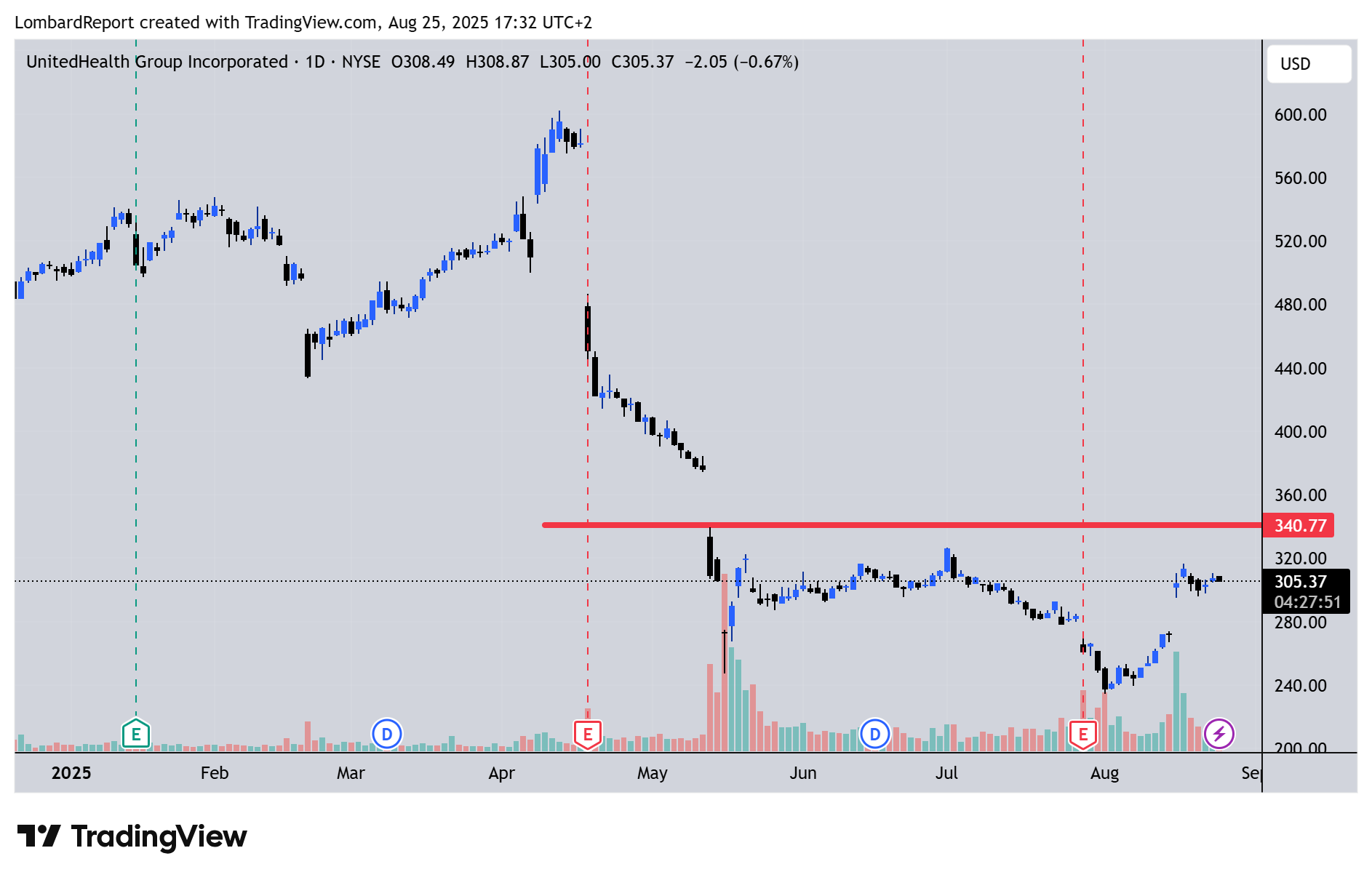 Attualmente il settore sanitario negli USA è in forte sconto: il segmento è valutato circa 16,6 volte gli utili attesi, contro le 23,3 del S&P 500 — il valore più basso in 30 anni. L’acquisto da parte di Berkshire Hathaway nelle ultime settimane ha alimentato un po’ di ottimismo in base al presupposto che tutto quello che fa Buffett e i suoi eredi è fatto bene. Per un potenziale raddoppio del prezzo azionario, UNH dovrebbe raggiungere un EPS di $24 e un multiplo P/E di 25x (o moderato scenario di +60% con multiplo 20x) Analisti come Morgan Stanley prevedono un EPS di $20,94 nel 2025 e $24,91 nel 2026, mantenendo rating Overweight, mentre Leerink rimane più cauta ma prevede una lenta ripresa fino al 2028.